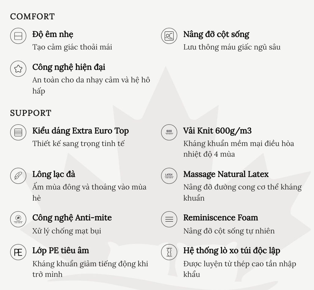 Nổi bật trong các lớp tiện nghi là 2 tầng foam tạo độ thông thoáng. Đồng thời lông lạc đà xen kẽ giữa các lớp tiện nghi và Latex 100% cao su thiên nhiên không chỉ êm ái mà còn lưu thông không khí, nâng niu giấc ngủ một cách tự nhiên nhất.