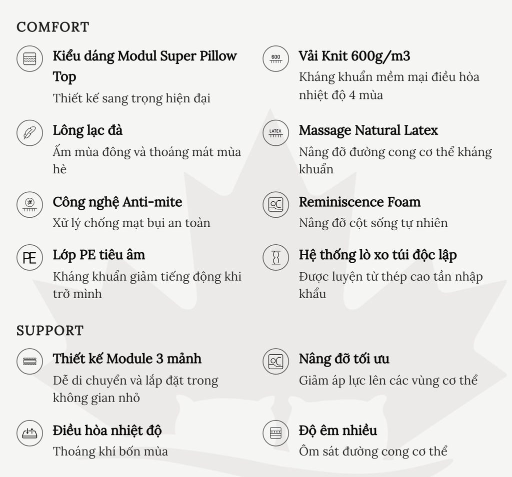 Thiết kế module rời theo phong cách phương Tây, ghép từ ba mảnh rời nhau giúp việc vệ sinh và vận chuyển dễ dàng hơn bao giờ hết. Đệm có cấu trúc định dạng mềm mại, phù hợp với người thích sự êm ái và đặc biệt tốt cho sống lưng.Nổi bật trong các lớp tiện nghi là 2 tầng foam định lượng cao tạo độ thông thoáng. Lông lạc đà xen kẽ các lớp tiện nghi và lớp Latex thiên nhiên giúp nâng niu giấc ngủ ngon.