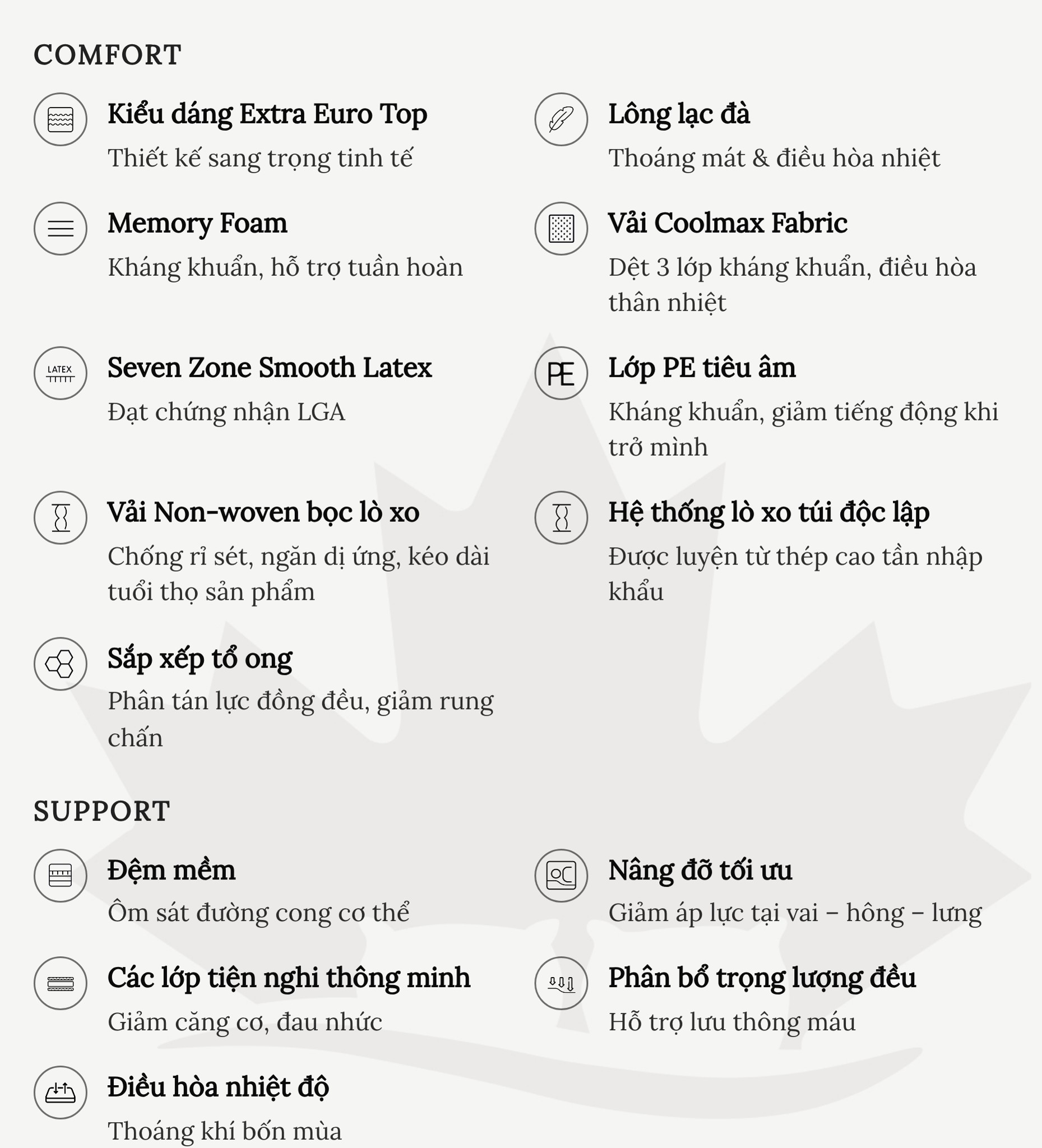 - Seven Zone Smooth Latex – Công nghệ hiện đại trong sản xuất cao su non thiên nhiên đạt độ dẻo dai và tính đàn hồi cao, tạo nên độ thông thoáng và nâng đỡ đa chiều cho cơ thể người nằm.